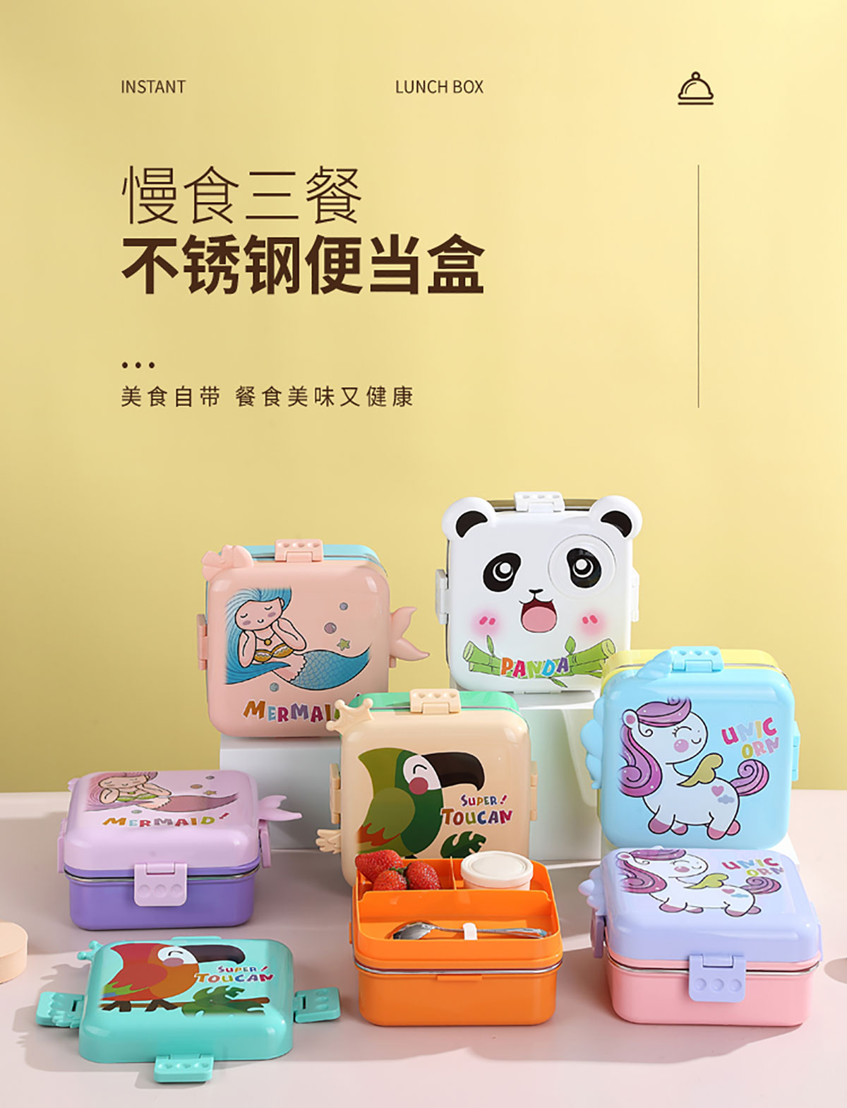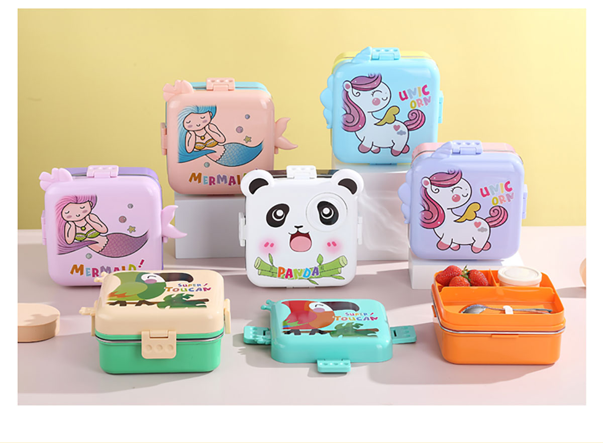 熊貓/大嘴鳥/獨角獸/美人魚正方形不銹鋼餐盒1120ml+70ml